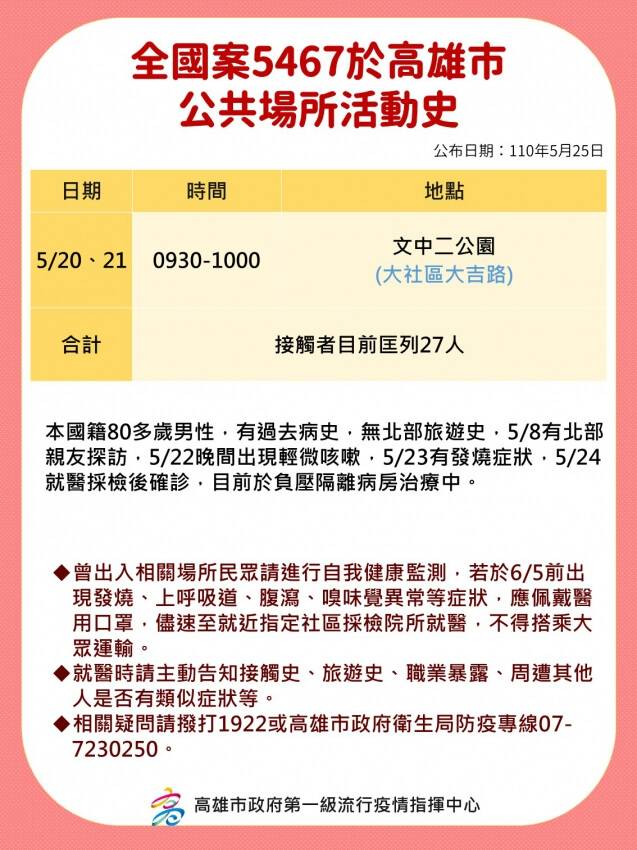 May 21, 2021 · 全台疫情嚴峻,高雄市今天再增4例確診個案,連日來已累積16例,高雄市長陳其邁將於下午3點舉行防疫記者會,公布確診者足跡,並同步在「高雄.